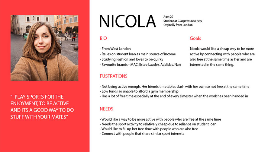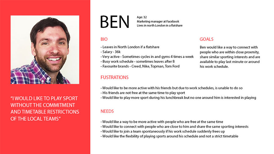 The aim of the project was to go through the UX process of creating a new app. I decided to create a sports app which allows users to connect with other users based on their sport interests and location. I will be highlighting some of the UX processes below. I have also created a detailed presentation about the project.