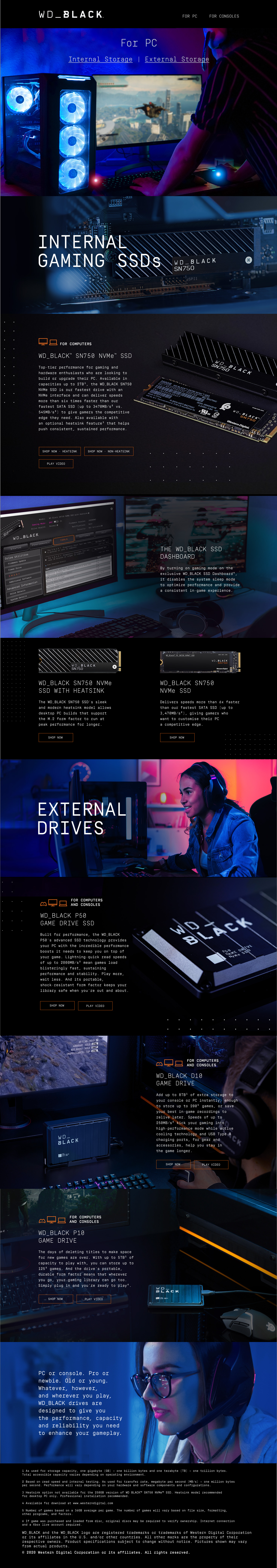 The below microsite showcases different gaming products from WD_BLACK. I was the lead designer from information architecture to wireframe to design. Below is one example of three pages supplied to retailers.